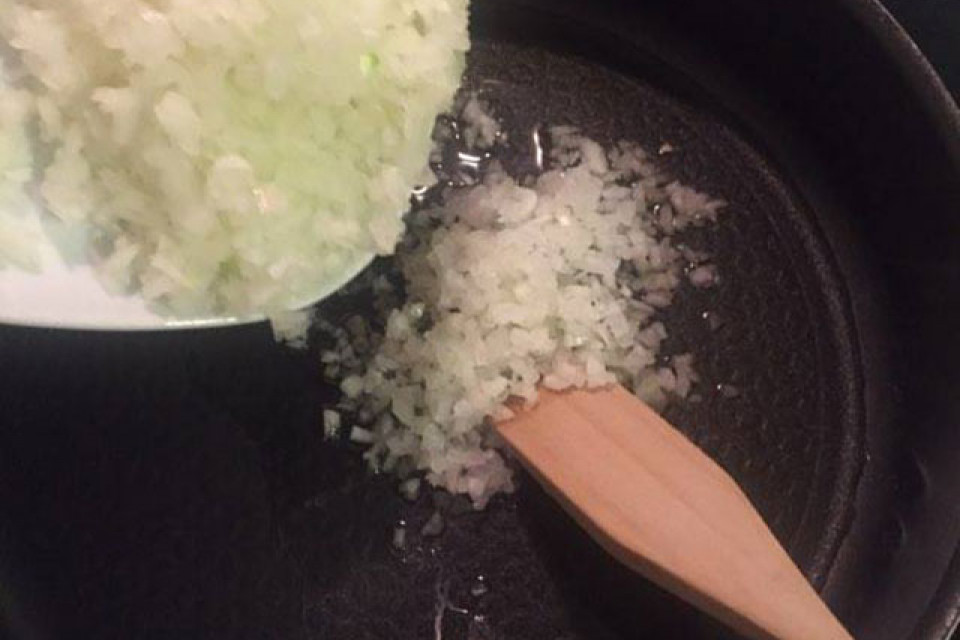 Шаг 1: На широкой сковородке мелко порезанный лук поджаривается на сильном огне на растительном масле (до порозовения).