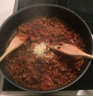 Шаг 3: Когда лук порозовеет, огонь переводится на средний. В него добавляется две столовых ложки салчи. Смесь перемешивается. Добавляется фарш, мелко порезанный чеснок, соль и специи (перец и кумин). Перемешивая, добавляется один стакан воды.