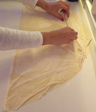 Шаг 2: На круг теста-юфки сверху добавляется соус. Пласт теста складывается пополам, как показано на рисунке.