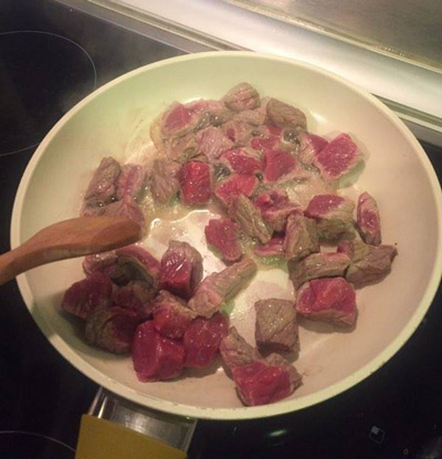Шаг 3: Слегка обжарить мясо на сковороде, чтобы из него ушла жидкость, а само оно начало покрываться серой "корочкой". Приблизительно в течение 5 минут.