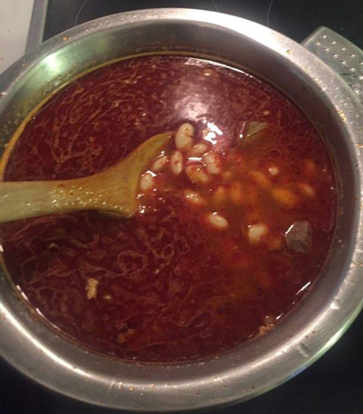 Шаг 5: В кастрюлю добавляется салча, разведенная в воде в пропорции 1 к 2 (то есть, на 2 столовых ложки салчи - 4 ложки воды), и помидор. И далее по списку: мясо, фасоль, кумин, черный и красный перец. В кастрюлю наливается 5-6 стаканов горячей кипячёной воды и добавляется соль по вкусу.