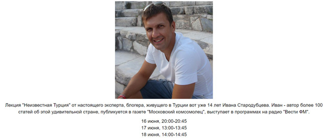 Ну, а я там буду на протяжении трех дней выступать в качестве "лектора" с докладами на тему Неизвестная Турция.