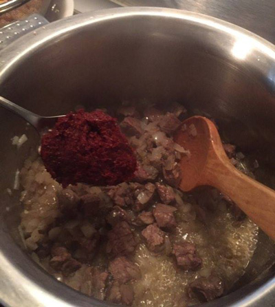 Шаг 5: Добавляется мясо и салча и обжариваются в течение 2-3 минут. Любители "остренького" также добавляют красный перец.