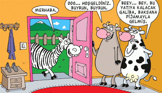 (Зебра: "Здравствуйте!", Бык: "ООО! Добро пожаловать! Проходите!", Корова: "Видимо, на ночь останется. Глянь-ка только, в пижаме пришёл!").