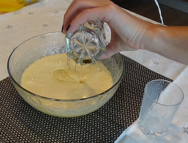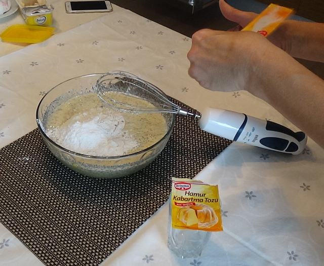 Шаг 4: Наконец, добавляется мука, ванилин и разрыхлитель. И окончательно всё взбивается.