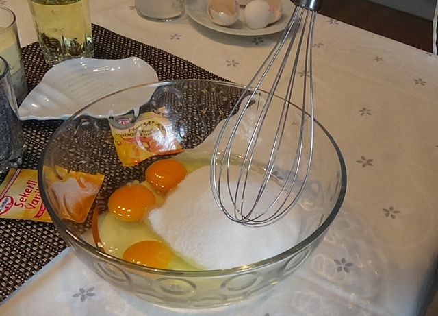 Шаг 1: Яйца и сахар взбиваются до вспенивания.